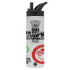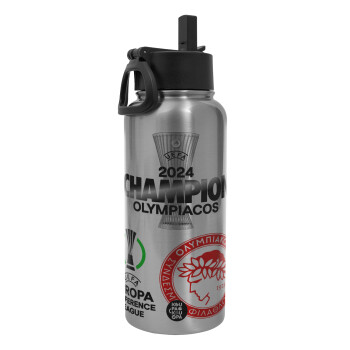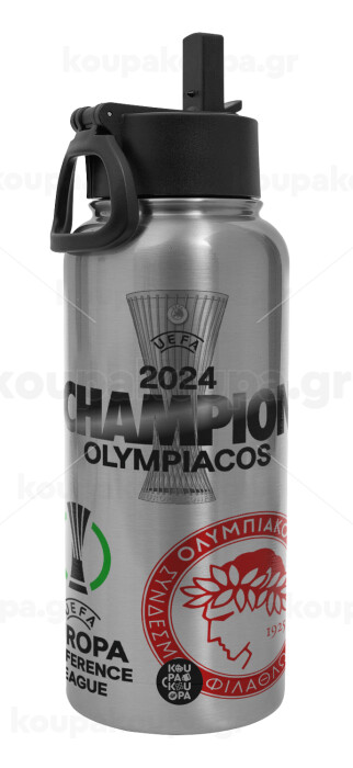 Olympiacos UEFA Europa Conference League Champion 2024, Μεταλλικό παγούρι θερμός Silver με καλαμάκι και χερούλι (Stainless steel), διπλού τοιχώματος, 950ml
