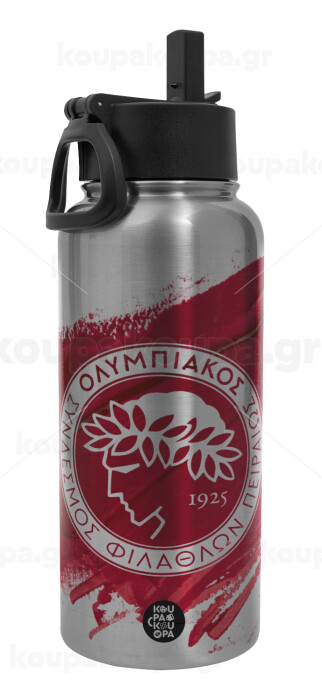 Olympiacos F.C., Μεταλλικό παγούρι θερμός Silver με καλαμάκι και χερούλι (Stainless steel), διπλού τοιχώματος, 950ml