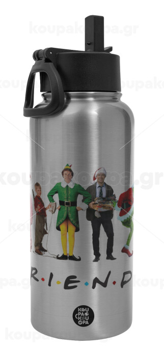 Christmas FRIENDS, Μεταλλικό παγούρι θερμός Silver με καλαμάκι και χερούλι (Stainless steel), διπλού τοιχώματος, 950ml