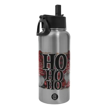 Ho ho ho, Μεταλλικό παγούρι θερμός Silver με καλαμάκι και χερούλι (Stainless steel), διπλού τοιχώματος, 950ml