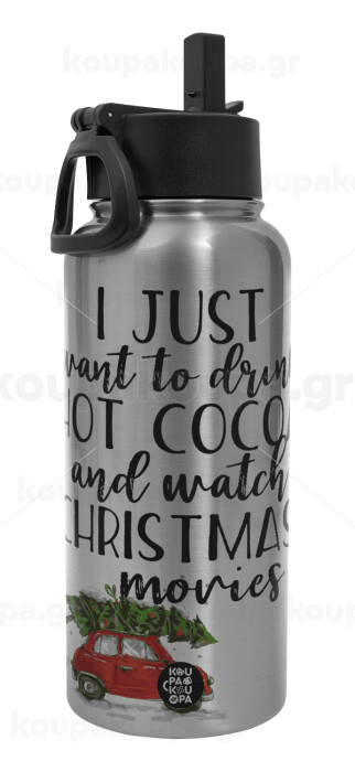 I just want to drink hot cocoa and watch christmas movies mini cooper, Μεταλλικό παγούρι θερμός Silver με καλαμάκι και χερούλι (Stainless steel), διπλού τοιχώματος, 950ml