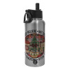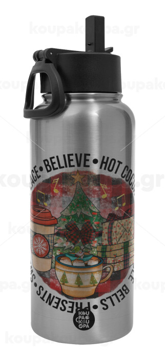 Joy, Peace, Believe, Hot Cocoa, Carols, Μεταλλικό παγούρι θερμός Silver με καλαμάκι και χερούλι (Stainless steel), διπλού τοιχώματος, 950ml