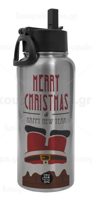 Merry christmas chimney, Μεταλλικό παγούρι θερμός Silver με καλαμάκι και χερούλι (Stainless steel), διπλού τοιχώματος, 950ml