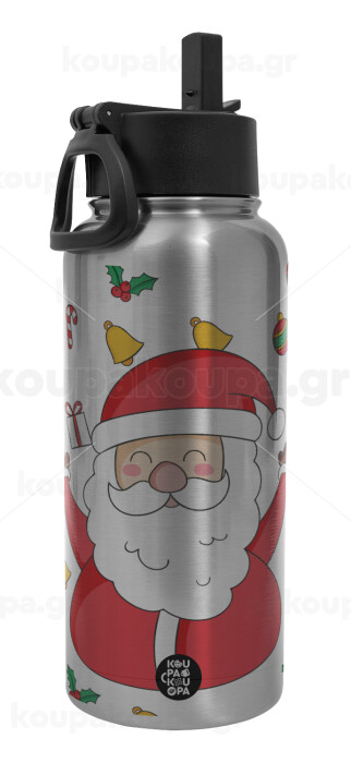 Santa Claus gifts, Μεταλλικό παγούρι θερμός Silver με καλαμάκι και χερούλι (Stainless steel), διπλού τοιχώματος, 950ml