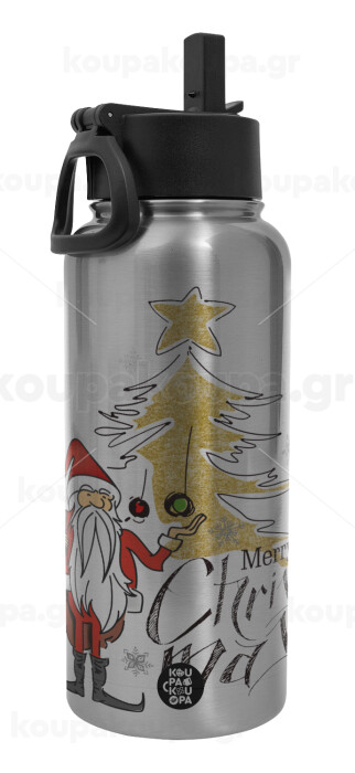 Santa Claus gold, Μεταλλικό παγούρι θερμός Silver με καλαμάκι και χερούλι (Stainless steel), διπλού τοιχώματος, 950ml