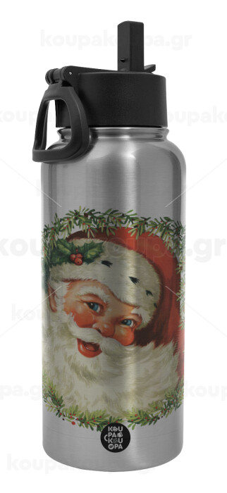 Santa Claus, Μεταλλικό παγούρι θερμός Silver με καλαμάκι και χερούλι (Stainless steel), διπλού τοιχώματος, 950ml