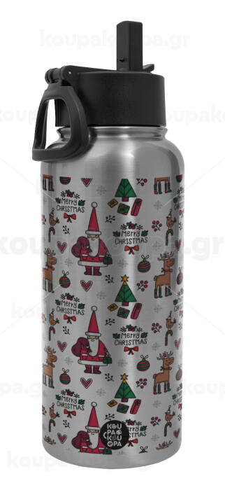 Santas, Deers & Trees, Μεταλλικό παγούρι θερμός Silver με καλαμάκι και χερούλι (Stainless steel), διπλού τοιχώματος, 950ml