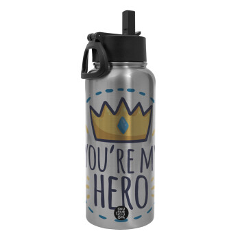 Dad, you are my hero!, Μεταλλικό παγούρι θερμός Silver με καλαμάκι και χερούλι (Stainless steel), διπλού τοιχώματος, 950ml