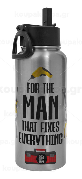 For the man that fixes everything!, Μεταλλικό παγούρι θερμός Silver με καλαμάκι και χερούλι (Stainless steel), διπλού τοιχώματος, 950ml