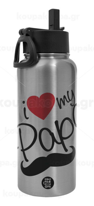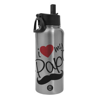 I Love my papa, Μεταλλικό παγούρι θερμός Silver με καλαμάκι και χερούλι (Stainless steel), διπλού τοιχώματος, 950ml