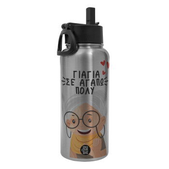 Γιαγιά σε αγαπώ πολύ!, Μεταλλικό παγούρι θερμός Silver με καλαμάκι και χερούλι (Stainless steel), διπλού τοιχώματος, 950ml