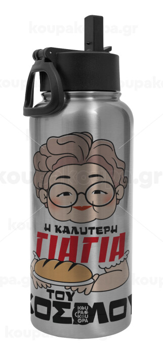 Η καλύτερη γιαγιά του κόσμου!, Μεταλλικό παγούρι θερμός Silver με καλαμάκι και χερούλι (Stainless steel), διπλού τοιχώματος, 950ml