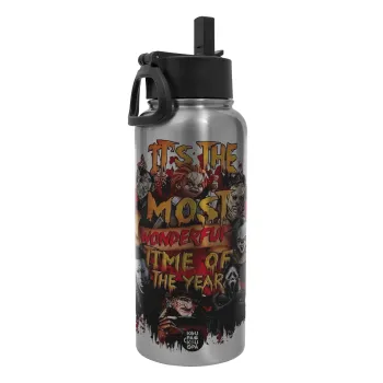 Halloween it's most wonderful time of the year, Μεταλλικό παγούρι θερμός Silver με καλαμάκι και χερούλι (Stainless steel), διπλού τοιχώματος, 950ml