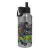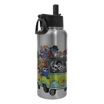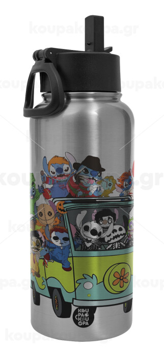Stitch Halloween scooby car, Μεταλλικό παγούρι θερμός Silver με καλαμάκι και χερούλι (Stainless steel), διπλού τοιχώματος, 950ml