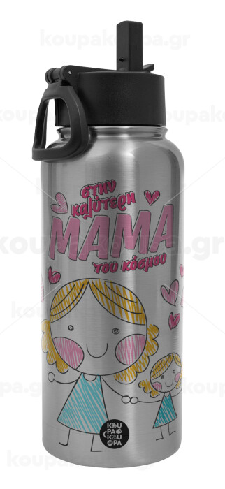 Στην καλύτερη μαμά του κόσμου, comic, Μεταλλικό παγούρι θερμός Silver με καλαμάκι και χερούλι (Stainless steel), διπλού τοιχώματος, 950ml