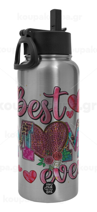 Best mom ever Mother's Day pink, Μεταλλικό παγούρι θερμός Silver με καλαμάκι και χερούλι (Stainless steel), διπλού τοιχώματος, 950ml