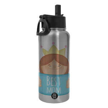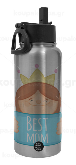 Best mom Princess, Μεταλλικό παγούρι θερμός Silver με καλαμάκι και χερούλι (Stainless steel), διπλού τοιχώματος, 950ml
