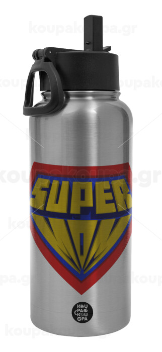 Super Mom 3D, Μεταλλικό παγούρι θερμός Silver με καλαμάκι και χερούλι (Stainless steel), διπλού τοιχώματος, 950ml
