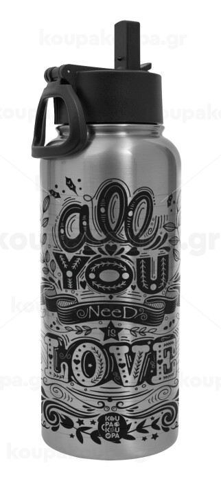 All you need is love, Μεταλλικό παγούρι θερμός Silver με καλαμάκι και χερούλι (Stainless steel), διπλού τοιχώματος, 950ml