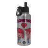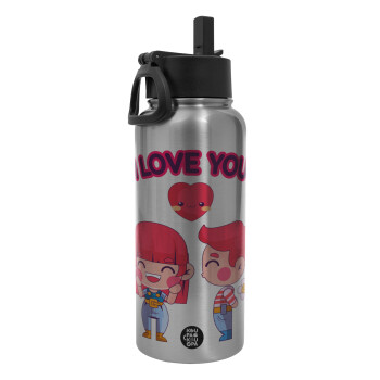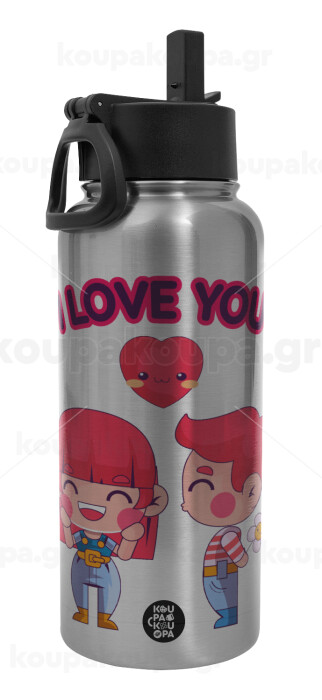 Couple, I love you, Μεταλλικό παγούρι θερμός Silver με καλαμάκι και χερούλι (Stainless steel), διπλού τοιχώματος, 950ml