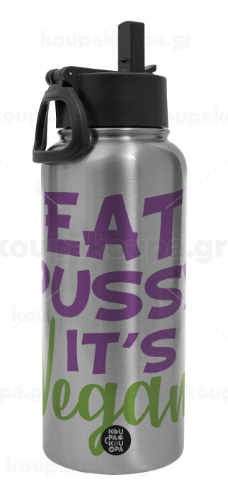 EAT pussy it's vegan, Μεταλλικό παγούρι θερμός Silver με καλαμάκι και χερούλι (Stainless steel), διπλού τοιχώματος, 950ml