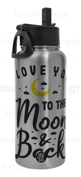 I love you to the moon and back, Μεταλλικό παγούρι θερμός Silver με καλαμάκι και χερούλι (Stainless steel), διπλού τοιχώματος, 950ml