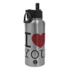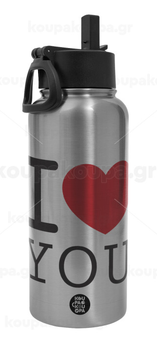 I Love you classic, Μεταλλικό παγούρι θερμός Silver με καλαμάκι και χερούλι (Stainless steel), διπλού τοιχώματος, 950ml