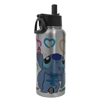 Lilo & Stitch painting, Μεταλλικό παγούρι θερμός Silver με καλαμάκι και χερούλι (Stainless steel), διπλού τοιχώματος, 950ml