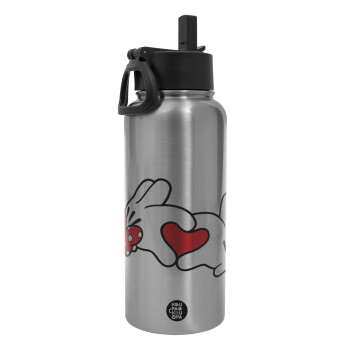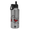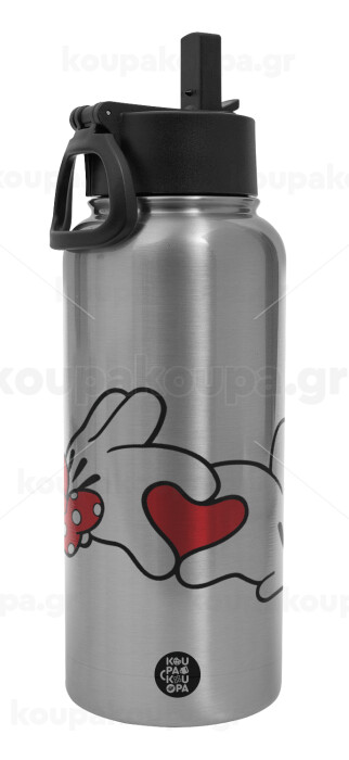 Love hands, Μεταλλικό παγούρι θερμός Silver με καλαμάκι και χερούλι (Stainless steel), διπλού τοιχώματος, 950ml