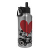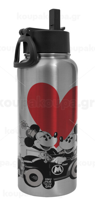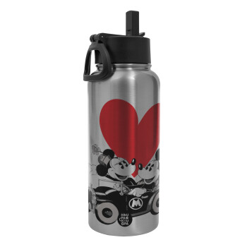 Mickey & Minnie love car, Μεταλλικό παγούρι θερμός Silver με καλαμάκι και χερούλι (Stainless steel), διπλού τοιχώματος, 950ml