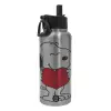 Snoopy takemy heart, Μεταλλικό παγούρι θερμός Silver με καλαμάκι και χερούλι (Stainless steel), διπλού τοιχώματος, 950ml