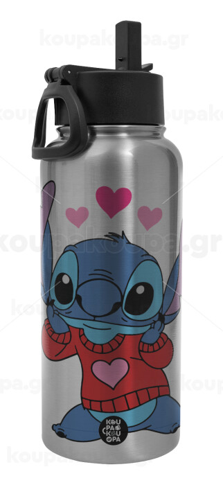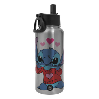 Stitch heart, Μεταλλικό παγούρι θερμός Silver με καλαμάκι και χερούλι (Stainless steel), διπλού τοιχώματος, 950ml