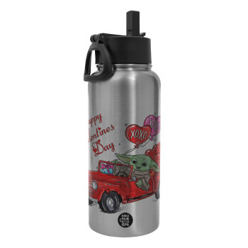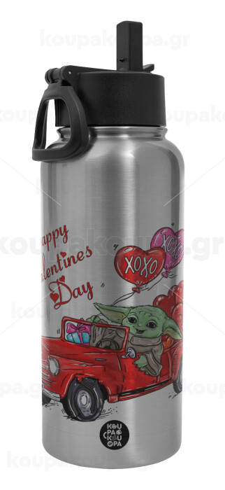 Yoda, happy valentines day (xoxo), Μεταλλικό παγούρι θερμός Silver με καλαμάκι και χερούλι (Stainless steel), διπλού τοιχώματος, 950ml