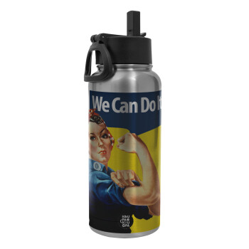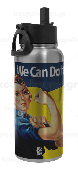 Rosie we can do it!, Μεταλλικό παγούρι θερμός Silver με καλαμάκι και χερούλι (Stainless steel), διπλού τοιχώματος, 950ml