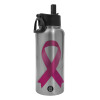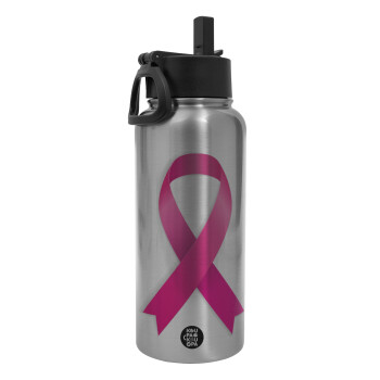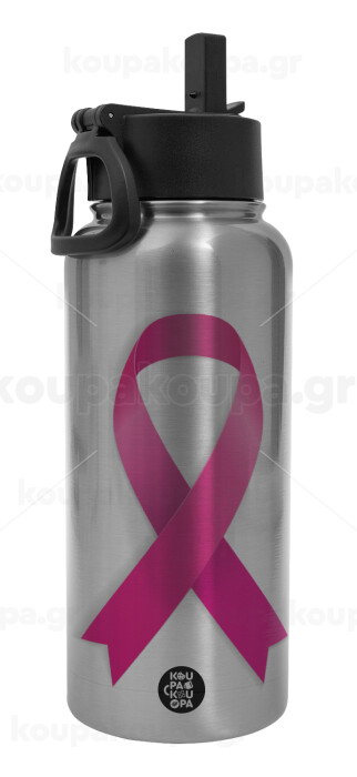 Παγκόσμια Ημέρα κατά του Καρκίνου, Μεταλλικό παγούρι θερμός Silver με καλαμάκι και χερούλι (Stainless steel), διπλού τοιχώματος, 950ml