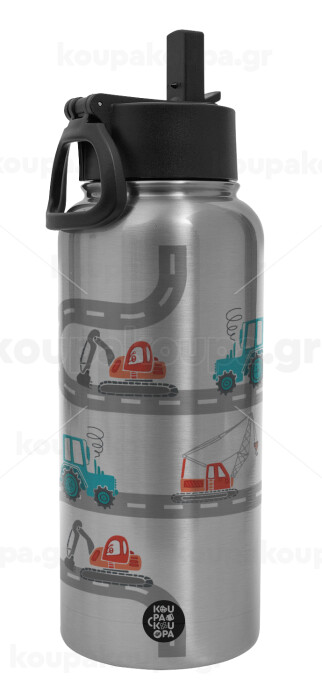 Αμαξάκια στον δρόμο, Μεταλλικό παγούρι θερμός Silver με καλαμάκι και χερούλι (Stainless steel), διπλού τοιχώματος, 950ml