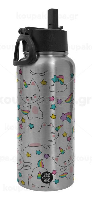 Cats unicorns, Μεταλλικό παγούρι θερμός Silver με καλαμάκι και χερούλι (Stainless steel), διπλού τοιχώματος, 950ml