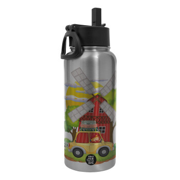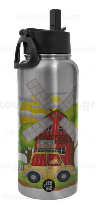 Toy car, Μεταλλικό παγούρι θερμός Silver με καλαμάκι και χερούλι (Stainless steel), διπλού τοιχώματος, 950ml