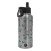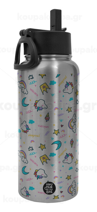 Unicorn pattern white, Μεταλλικό παγούρι θερμός Silver με καλαμάκι και χερούλι (Stainless steel), διπλού τοιχώματος, 950ml
