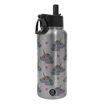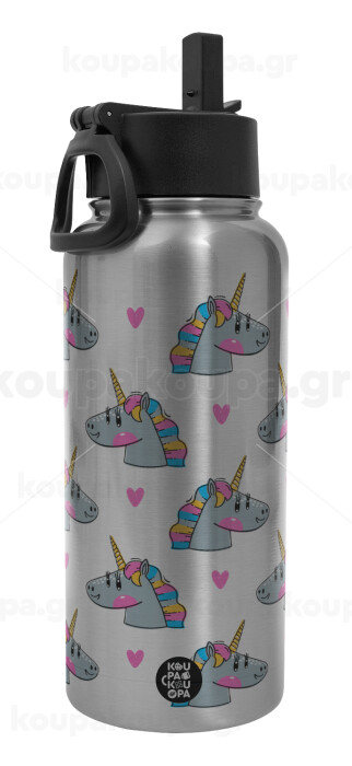 Unicorn, Μεταλλικό παγούρι θερμός Silver με καλαμάκι και χερούλι (Stainless steel), διπλού τοιχώματος, 950ml