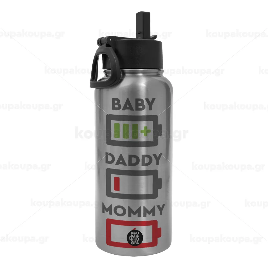BABY, MOMMY, DADDY Low battery, Μεταλλικό παγούρι θερμός Silver με καλαμάκι και χερούλι (Stainless steel), διπλού τοιχώματος, 950ml