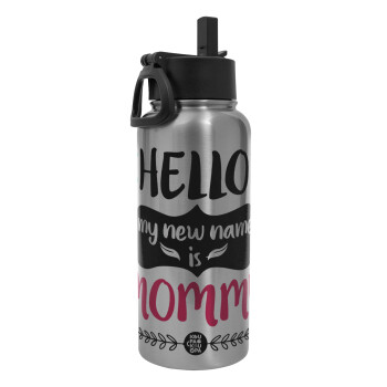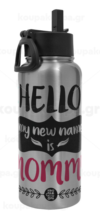 Hello, my new name is Mommy, Μεταλλικό παγούρι θερμός Silver με καλαμάκι και χερούλι (Stainless steel), διπλού τοιχώματος, 950ml