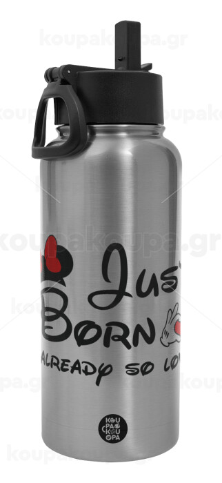 Just born already so loved, Μεταλλικό παγούρι θερμός Silver με καλαμάκι και χερούλι (Stainless steel), διπλού τοιχώματος, 950ml