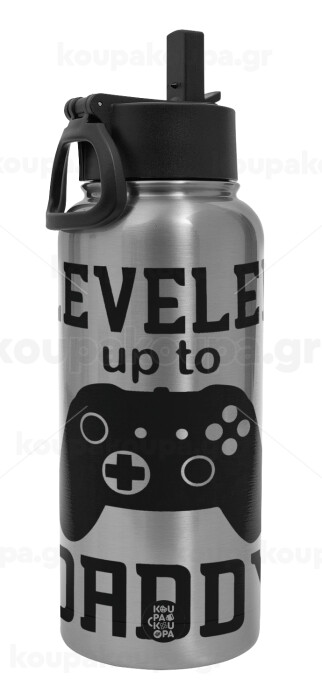Leveled to Daddy, Μεταλλικό παγούρι θερμός Silver με καλαμάκι και χερούλι (Stainless steel), διπλού τοιχώματος, 950ml