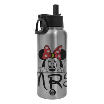 Minnie Mrs, Μεταλλικό παγούρι θερμός Silver με καλαμάκι και χερούλι (Stainless steel), διπλού τοιχώματος, 950ml