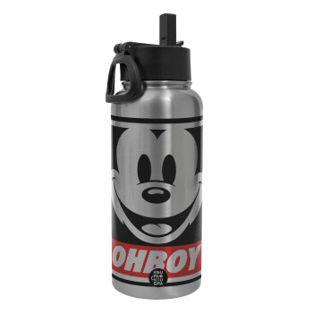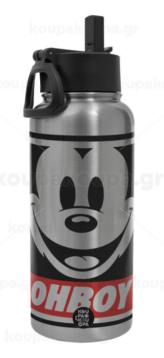 Oh boy μίκυ, Μεταλλικό παγούρι θερμός Silver με καλαμάκι και χερούλι (Stainless steel), διπλού τοιχώματος, 950ml