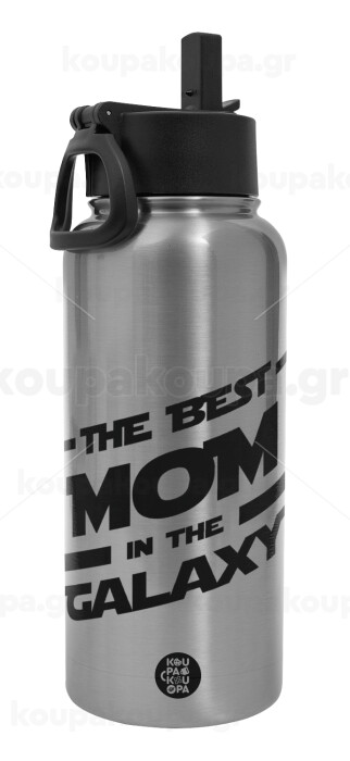 The Best MOM in the Galaxy, Μεταλλικό παγούρι θερμός Silver με καλαμάκι και χερούλι (Stainless steel), διπλού τοιχώματος, 950ml
