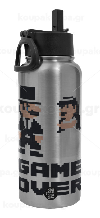 8bit Game Over Couple Wedding, Μεταλλικό παγούρι θερμός Silver με καλαμάκι και χερούλι (Stainless steel), διπλού τοιχώματος, 950ml