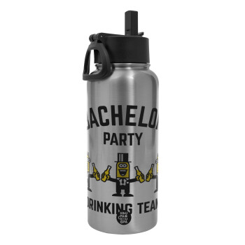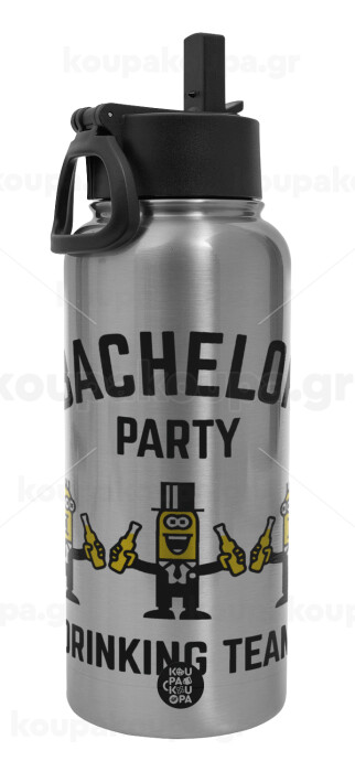 Bachelor Party Drinking Team, Μεταλλικό παγούρι θερμός Silver με καλαμάκι και χερούλι (Stainless steel), διπλού τοιχώματος, 950ml