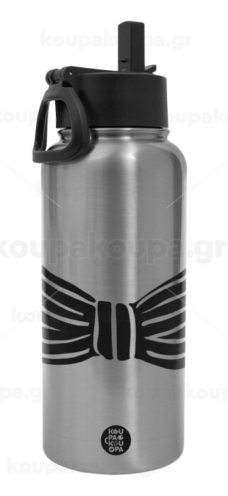Bow tie, Μεταλλικό παγούρι θερμός Silver με καλαμάκι και χερούλι (Stainless steel), διπλού τοιχώματος, 950ml